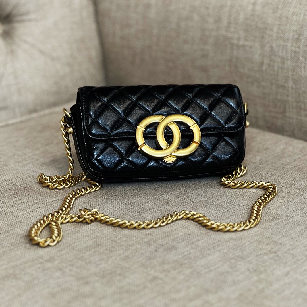 Chanel Shiny Calfskin Quilted Flap( Phone Holder With Chain Black)